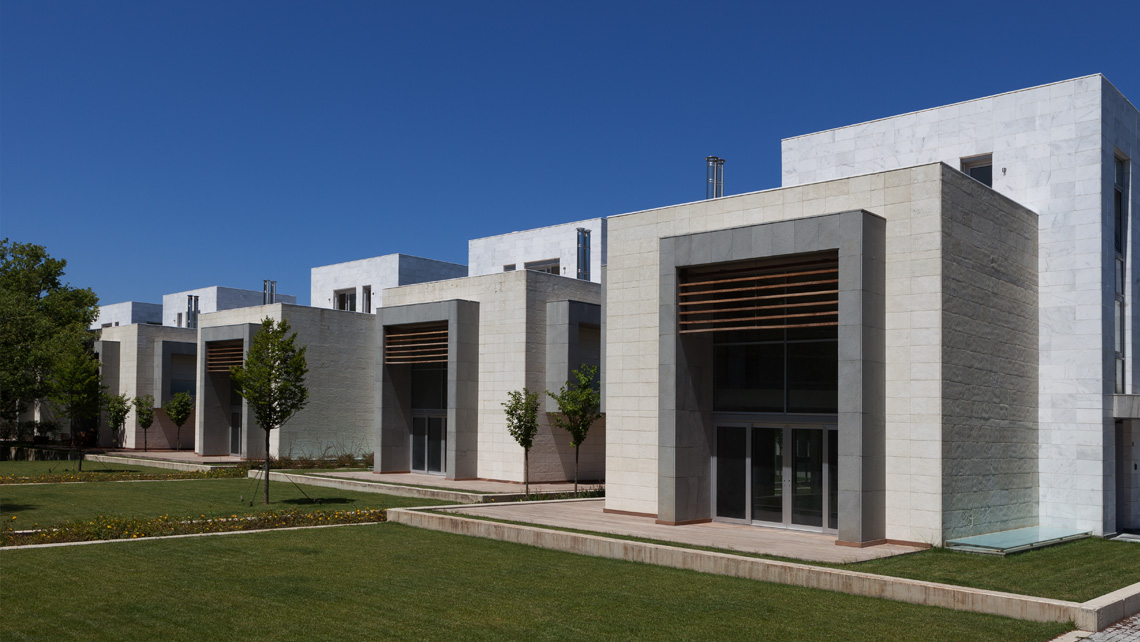 Bir ana dikdörtgen prizmaya eklemlenen prizmalardan oluşan bina kütlesinin cepheleri de sade ve net çizgilerle tasarlandı. Binaların malzeme kararları da bu doğrultuyu izledi. Yapı,doğal taş (küfeki, yeşil andezit), cam, ahşap gibi üç ana malzeme ile giydirildi.