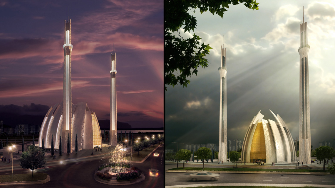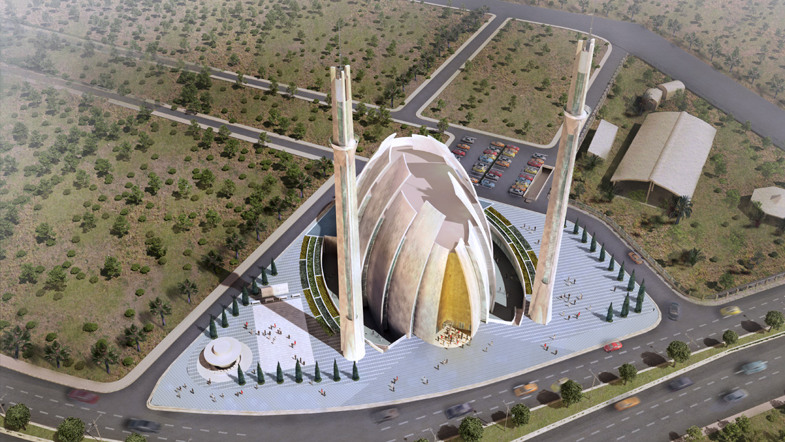 Mavi şehir camisinin formu, "dua eden eller" formundan hareket ederek; gökyüzüne yükselen eğrisel pano duvarların eliptik bir zemin üzerinde kademelenerek oval bir iç mekan oluşturacak şekilde düzenlenmesiyle elde edildi. Bu oval iç mekan kademeli pano duvarlarla yüksek bir akustik performansı gösterecektir. 30 m'den 40 m'ye kadar kademelenen pano duvarların araları açılarak mekan boyunca içeriye kuzey sabit ışığını alan şerit pencereler tasarlandı. Girişteki pano duvarlar taç kapıyı oluşturuyor.