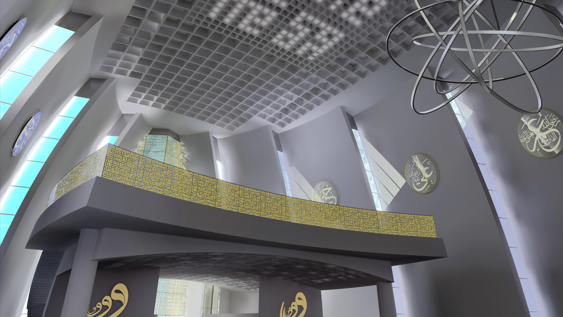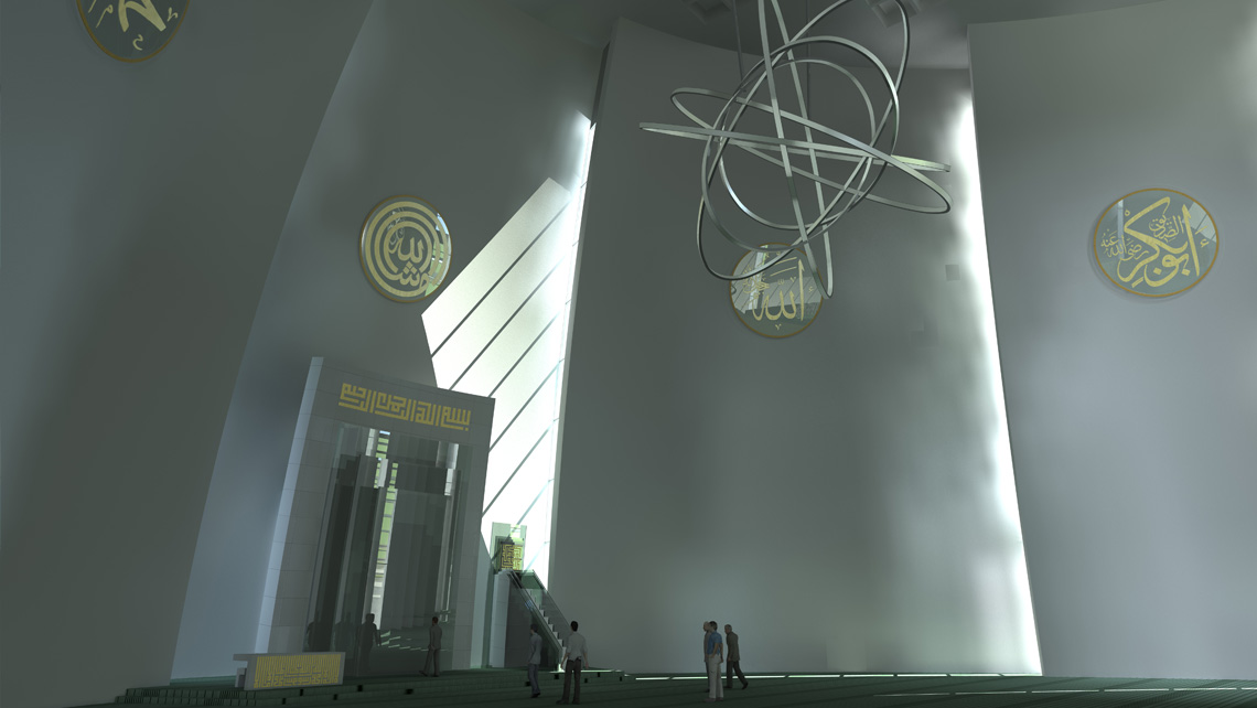 En büyük cam sathın bulunduğu bu bölüm küfi veya sülüs yazı ile yazılmış ihlas süresi ve fatiha süresi yazılarıyla yapılmış bir metal "screen"le kaplanacak. Cami 2500 kişi alan kapalı ibadet mekanı, 2500 kişilik açık ibadet alanı ile toplam 5000 kişi kapasiteye sahiptir. Bodrum katta biri 300 kişilik, diğeri 700 kişilik olmak üzere iki konferans salonu ve çeşitli büyüklüklerde 7 adet derslik bulunmaktadır. Caminin iki yanında oluşturulan iç avlu etrafında, bir yanda dernek odası, toplantı salonları, kütüphane, diğer yanda imaret ve iki adet lojman yeralmaktadır.