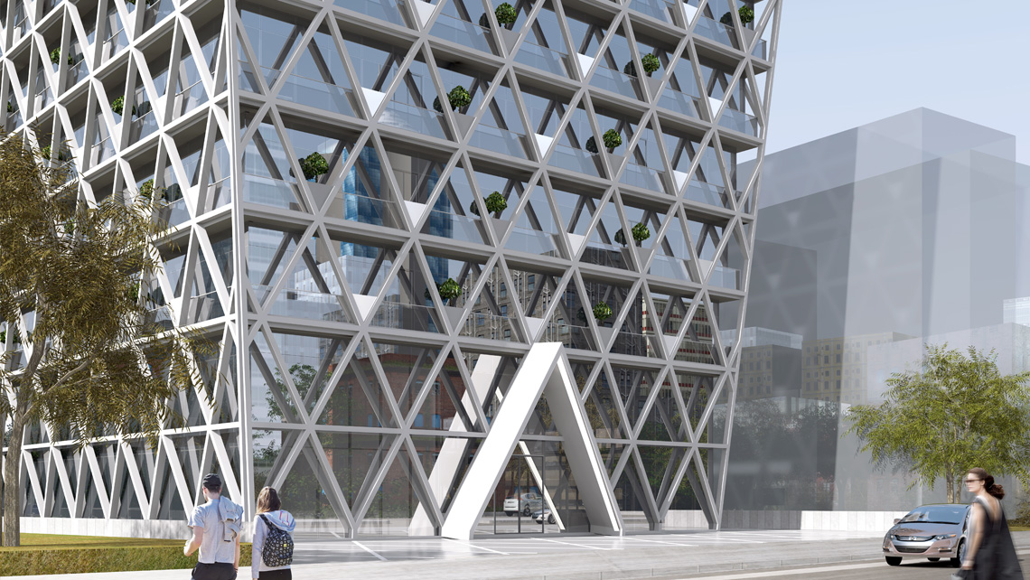 Büyükdere Caddesi üzerinde Levent çeperinde yeralan arsa, etrafı çok kısa süre sonra dönüşecek küçük sanayi yapılarıyla çevrili. Yakınında da referans olacak nitelikte bir yapı olmamasından dolayı, tasarımı temel olarak çevreye röper veren ekspressif özellikli bir kurguyla biçimlendirdik.Taşıyıcı çelik sistem brütalist bir tavırla binanın cephe elemanı gibi dışa vuruyor, imajla fonksiyonu birleştiriyor. Binanın kavram, strüktür sistemi ve biçim olarak çevredeki yapılaşmadan ayırdedilmesini istedik. Meyilli cephe satıhları, üçgen çelik çatkılarıyla ve tasarımın bünyesinde olan aydınlatma elemanları ile ışıldayan bir yüzük taşı elde etmeyi hedefledik.