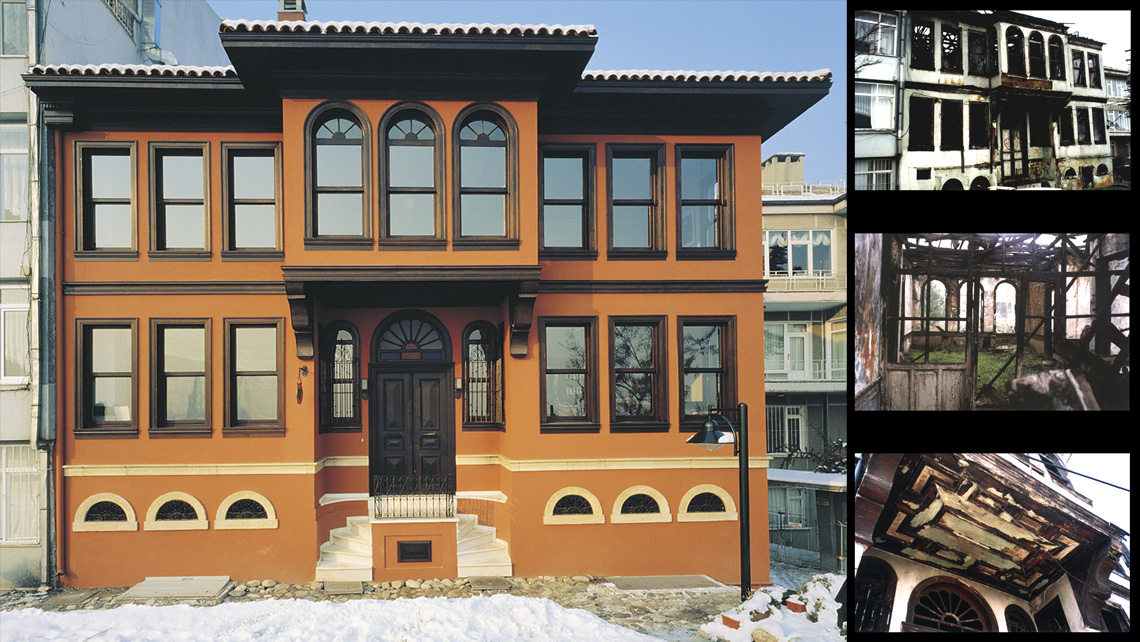 Although the number of available rooms was diminished, a supplementary structure in the garden, which did not have any relationship with the building was pulled down. The burned down wooden structure of the building was rebuilt in reinforced concrete, but in order to preserve the original interior details, their surveys were made (such as ceiling, floor, interior doors, eaves). Some of these cornponents were reused after being exposed to physical and chemical conservation processes and some of them were rebuilt according to the survey drawings in order to revitalize the original image of the building. The detail surveys were used as application details combined with the reinforced concrete structure in all possible points.