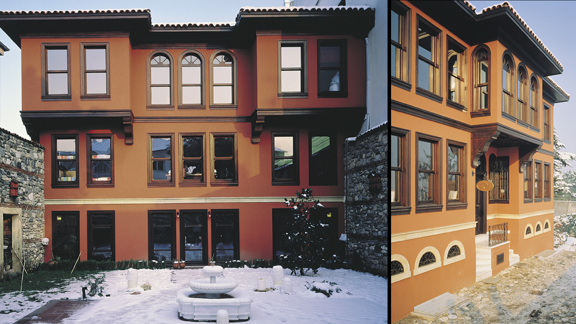 The building which is an example of traditional civil architecture is situated on Burçüstü Street in the Tophane district of Bursa. Due to a fire in 1995, it had Iost its roof completely and was open to alI weather conditions. Thus, the roof stucture was demolished, the building construction was eroded and some details were worn out. The original bad bearing structure of the building constituted of wood frame filled in with brick: a half timber construction. The project design kept the original spatial structure of the building only adding some minor changes the new function required. The central-hall plan was preserved but some of the rooms were unified to gam exhibition space. High book shelves replaced the previously existing seperation walls of these unified spaces, thus maintaining the original plan.