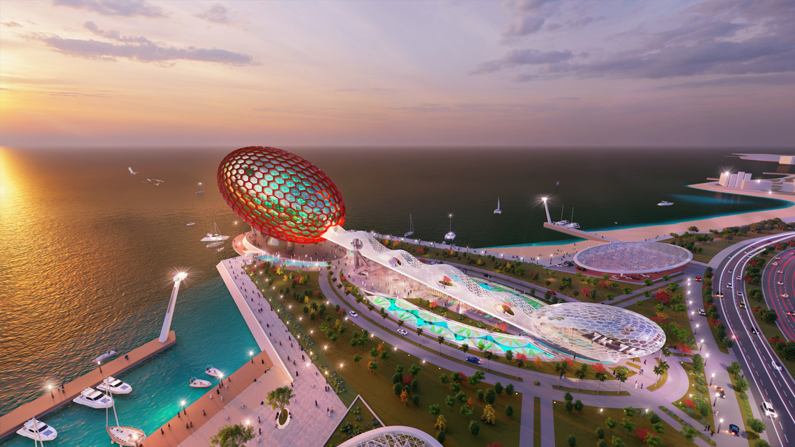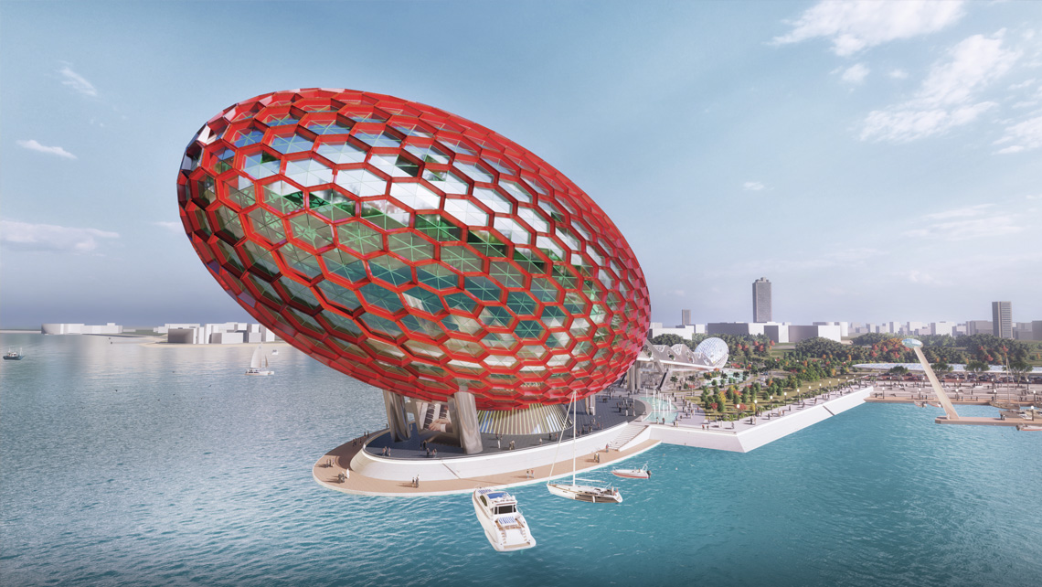 with its gigantic ellipsoid form, functional brutalist
