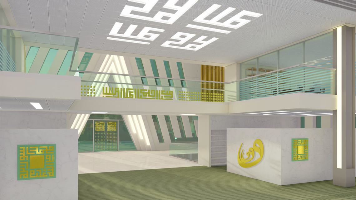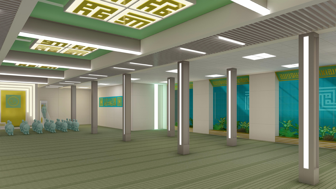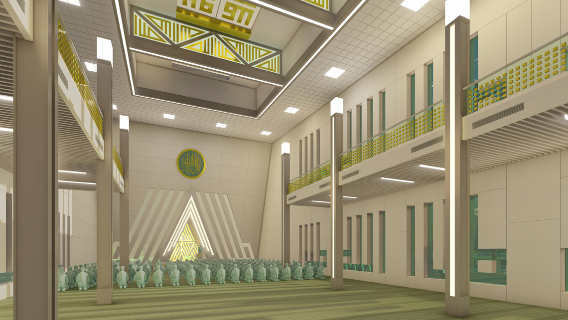 Cami girişi geleneksel mimarideki mukarnaslı taç kapılarını soyutlayarak "A" (Allah c.c.) harfinden hareketle mekâna davet edici bir biçimde şekillendirilmiştir. Ayrıca bu giriş ve mihrapta birbirine aynalınmış kûfi Allah (c.c.) yazısı ile "Yaradana Dua eden Eller" metaforu oluşturulmuştur. Cami kütlesinin dört beden duvarında kûfi yazıyla "Allah (c.c.)" şeklindeki pencerelerden giren günışığı ile aydınlık ibadet mekânı elde edilmiştir. ("Allah'ın nuru mekânı ve insanları aydınlatıyor.) Meyilli çatıdan da kûfi dönel "Allah/Muhammed" yazılarından süzülerek gün ışığı ana mekâna girmektedir. Ana girişten başka, biri kadınlar girişi olmak üzere iki yan giriş düzenlenmiştir.