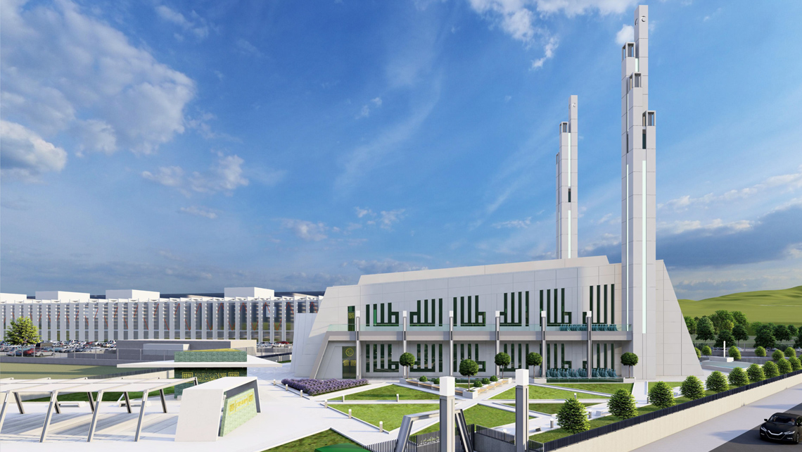 kuvvetlendirilmiştir. Kare tabanlı minarelerin içinde, ortasında asansör olan bir merdiven "şerefe" bölümüne kadar çıkmaktadır. Kolonatlı yarı açık, açık ibadet mekanları Aselsan binalarının kolonatlı cephelerine gönderme yapmaktadır.